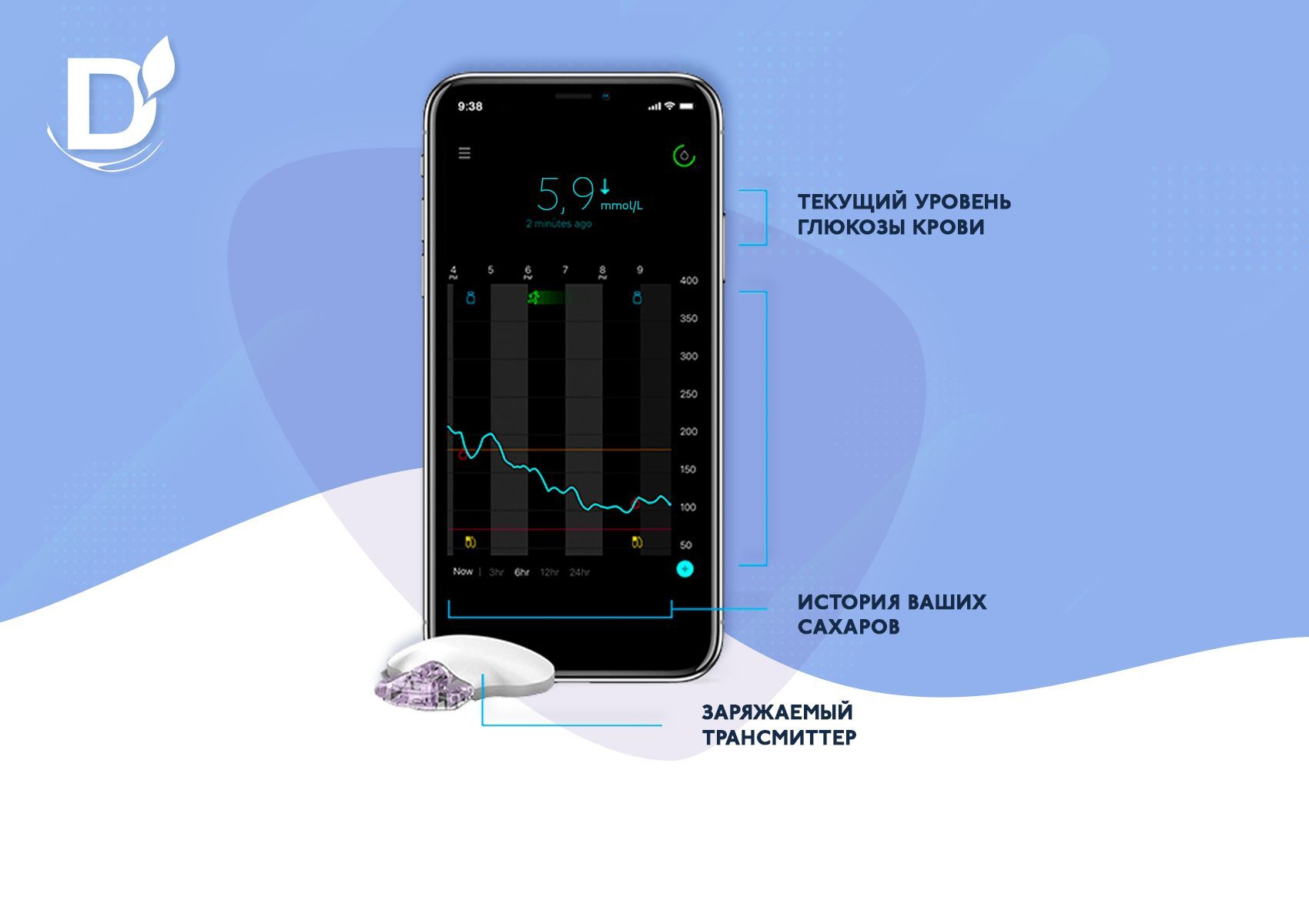НМГ - это система, позволяющая отслеживать уровень сахара крови в режиме реального времени. Стандартная система НМГ состоит из: сенсора, передатчика и ридера/смартфона/умных часов и т.п. Таким образом, вы можете узнать уровень сахара крови моментально и без проколов: просто приложив ридер к сенсору или посмотрев на экран телефона.