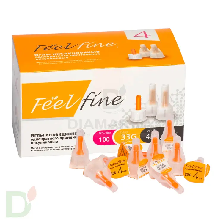 <h2> Иглы ФилФайн 33G 4 мм для шприц-ручек – комфорт и точность инъекций </h2> <p> Иглы ФилФайн 33G длиной 4 мм — ультратонкие иглы, созданные для максимального комфорта при ежедневных инъекциях. Эти иглы особенно подходят детям, людям с чувствительной кожей и всем, кто боится уколов. Надежность и удобство использования делают процесс контроля гликемии проще и комфортнее. </p> <p> </p> <h2>Почему выбирают ФилФайн</h2> <p> </p> <ul> <li> <p> Ультратонкие 33G иглы (0,2 мм) — одна из самых тонких на рынке, минимизируют травму тканей.<br> </p> </li> <li> <p> Трехгранная ручная заточка и лазерная шлифовка делают введение иглы точным и плавным.<br> </p> </li> <li> <p> Двойное силиконовое покрытие обеспечивает мягкое скольжение и комфорт при уколе.<br> </p> </li> <li> <p> Увеличенный внутренний просвет ускоряет прохождение инсулина, снижая силу напора и травматизацию тканей. </p> </li> <li> <p> Стерильные и одноразовые — безопасны и удобны в утилизации. </p> </li> </ul> <p> </p> <br> <p> <span style="font-size: 1.5em;">Как использовать для максимального комфорта</span> </p> <p> Снимите внешний колпачок, прикрутите иглу FeelFine к вашей шприц-ручке, удалите внутренний защитный колпачок и сделайте укол под 90°. Используйте одну иглу один раз — это безопасно и снижает риск раздражений. После инъекции утилизируйте иглу в специальный контейнер для острых предметов. Совместимость со всеми популярными шприц-ручками гарантирует удобство и предсказуемость. </p> <p> </p> <h3>Дополнительная информация: </h3> <ul> <li> <p> Производитель: Южная Корея </p> </li> <li> <p> Длина: 4 мм </p> </li> <li> <p> Толщина: 33G (0,21 мм) </p> </li> <li> <p> Совместимость: подходит для всех стандартных шприц-ручек </p> </li> <li> <p> Объём / вес: упаковка 100 игл </p> </li> </ul> <p> </p> <p> <b>Добавьте в корзину сейчас, чтобы сделать инъекции точными, удобными и безопасными, сэкономить время и заботиться о комфорте каждый день.</b> </p>
