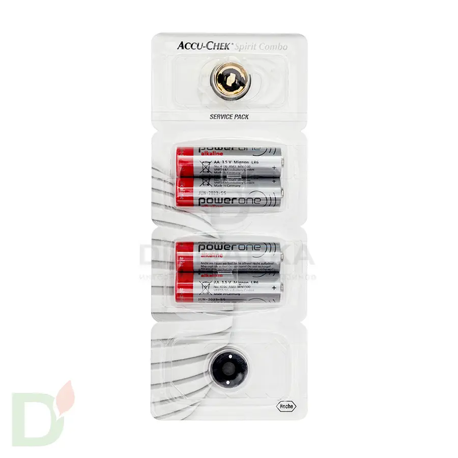 Сервисный набор Акку-Чек Спирит Комбо на 3 месяца: адаптер, 4 батарейки, крышка, ключ. Защита помпы от влаги и пыли.