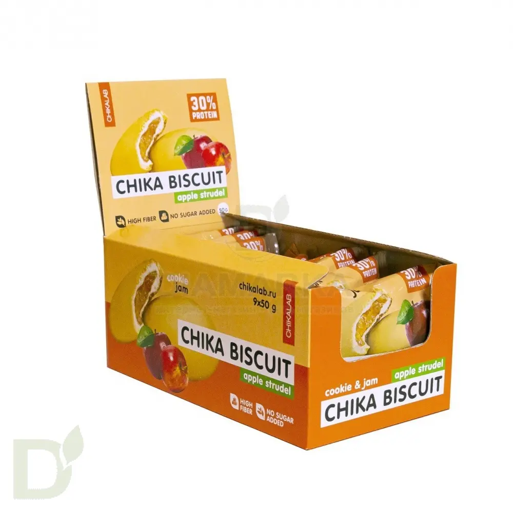 <h2>Печенье, на 30% состоящее из протеина</h2> Чика Бисквит на 30% состоит из молочного протеина. Это даже больше, чем в 100 граммовом стейке из говядины! Одной печеньки будет вполне достаточно, чтобы насытиться и бодро и активно продолжать свой день.<br> <h2>Десерт Chika Biscuit без сахара и муки</h2> Благодаря замене муки на протеин, а сахара на безуглеводный подсластитель (сукралоза) производителям удалось существенно снизить количество углеводов. Только представьте: в 100 граммах протеинового печенья содержится 4 грамма углеводов, в то время как в обычных их количество колеблется на отметке 65-70 грамм.<br> <br> Бисквит дополнительно обогащен пищевым волокном, про пользу которого вы уже наверняка наслышаны.<br> Такое печенье подойдет и для вечернего перекуса, и в качестве “загрузки” перед тренировкой, и для посиделок за чашечкой кофе.<br> <h2>Состав печенья Яблочный штрудель</h2> белковая смесь (концентрат сывороточного белка, концентрат молочного белка), начинка плодовая (яблоко, подсластитель (эритрит), агент влагоудерживающий (глицерин), порошок яблочный, стабилизатор (крахмал кукурузный), ароматизатор натуральный, консервант (сорбат калия)), водорастворимые волокна кукурузы, инулин (водорастворимые волокна из цикория), масло кокосовое, вода, продукты яичные (меланж яичный), корица, влагоудерживающий агент (глицерин), регулятор кислотности (гидрокарбонат натрия (сода пищевая), лимонная кислота), соль, ароматизаторы натуральные, эмульгатор (соевый лецитин), подсластитель (сукралоза), консервант (сорбат калия).<br> <br> Может содержать следы арахиса, фундука, кешью.<br> При чрезмерном употреблении может оказывать слабительное действие.<br> <h2>КБЖУ на 1 печенье / 50 грамм</h2> <ul> <li>Белки - 15;</li> <li> Жиры - 5.3;</li> <li> Углеводы - 2.9;</li> <li> Пищевые волокна - 13;</li> <li> Ккал - 145</li> </ul> Срок годности 6 месяцев
